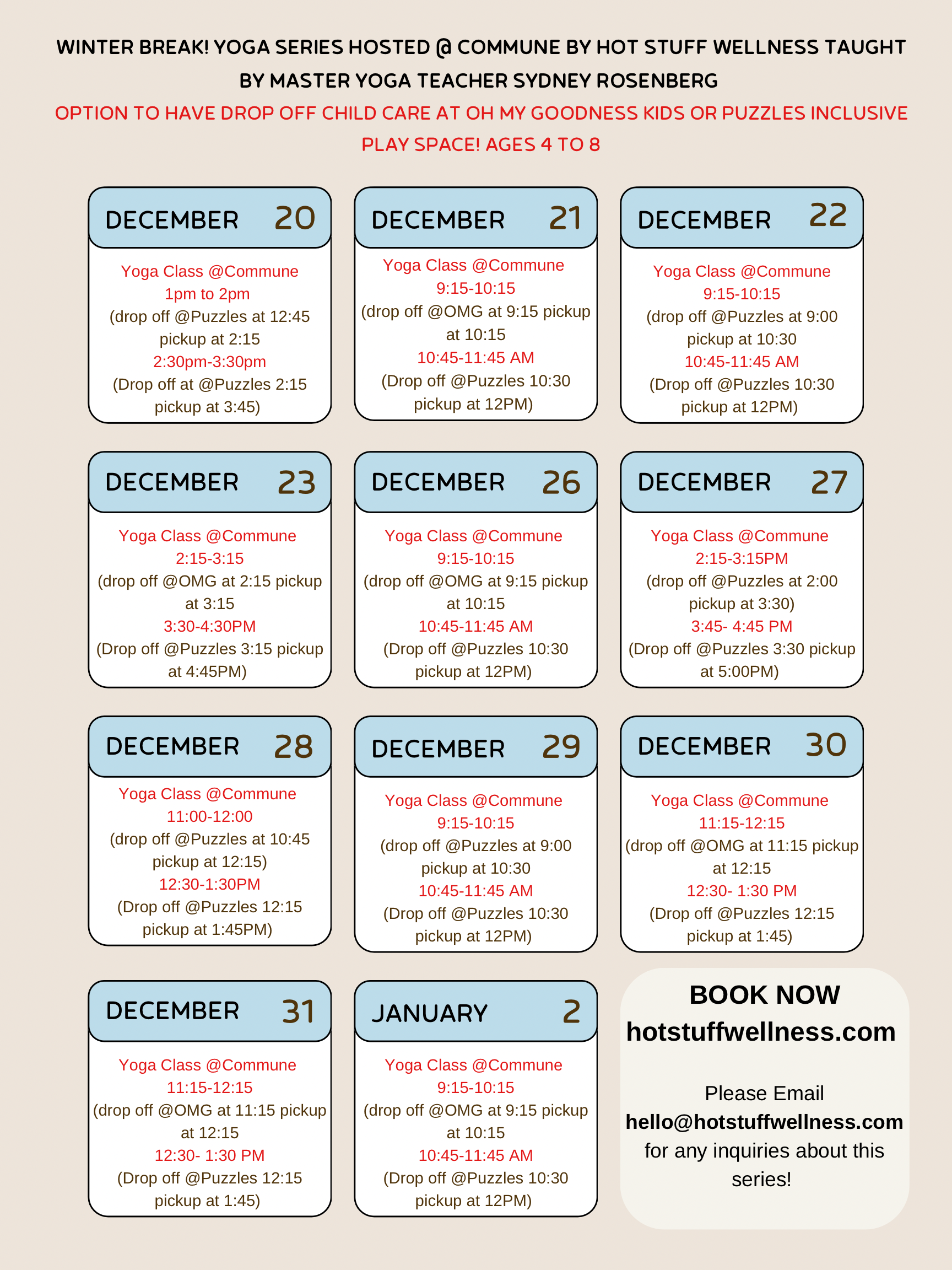 Hot Stuff Wellness is partnering with Puzzles Inclusive Play Space and Oh My Goodness Kids to offer optional drop off childcare for ages 4 to 8 during your yoga session. Click the link below to reserve your spot.